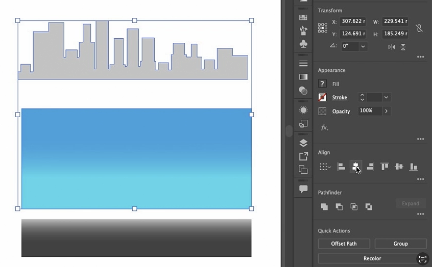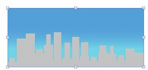 먼저, 도시 풍경 모양(사실은 여러 개의 직사각형이 연결된 형태)을 선택해서 그 아래에 있는 모양에 대해 가로 중앙 정렬과 아래 정렬을 해보세요.