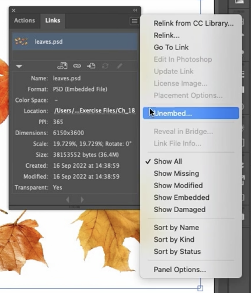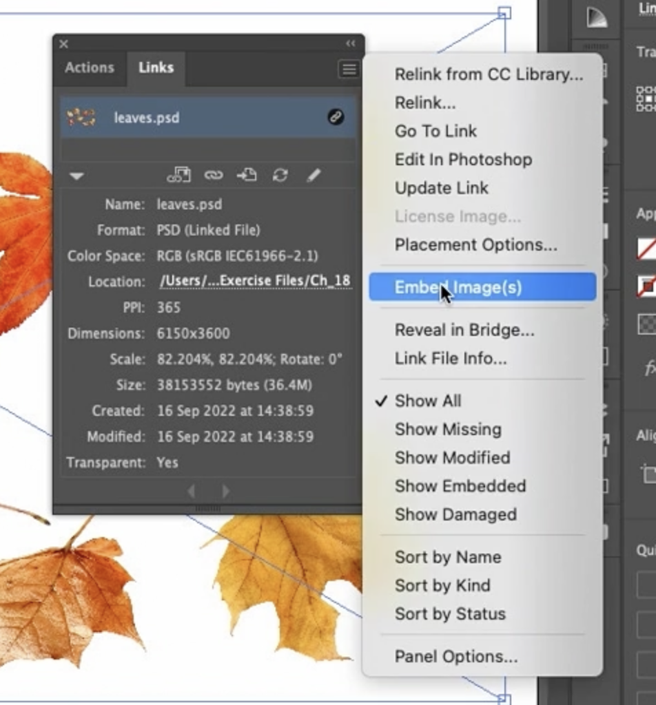 링크 패널에서 플라이아웃 메뉴를 열고 **이미지 임베드(Embed Images)**를 선택합니다. 포토샵에서 가져온 파일의 경우, 포토샵 가져오기 옵션(Photoshop Import Options) 창이 나타납니다. 여기서는 이미지를 단일 이미지로 **래스터화(Flatten)**하는 옵션을 선택하고 "확인"을 클릭하면 모든 이미지 데이터가 파일에 포함됩니다.