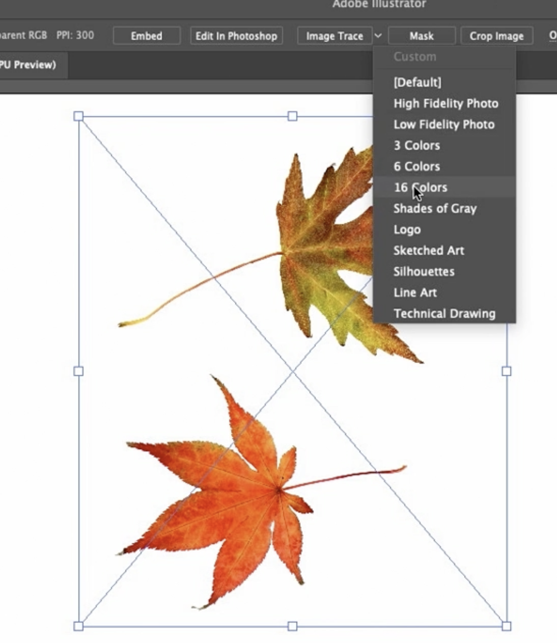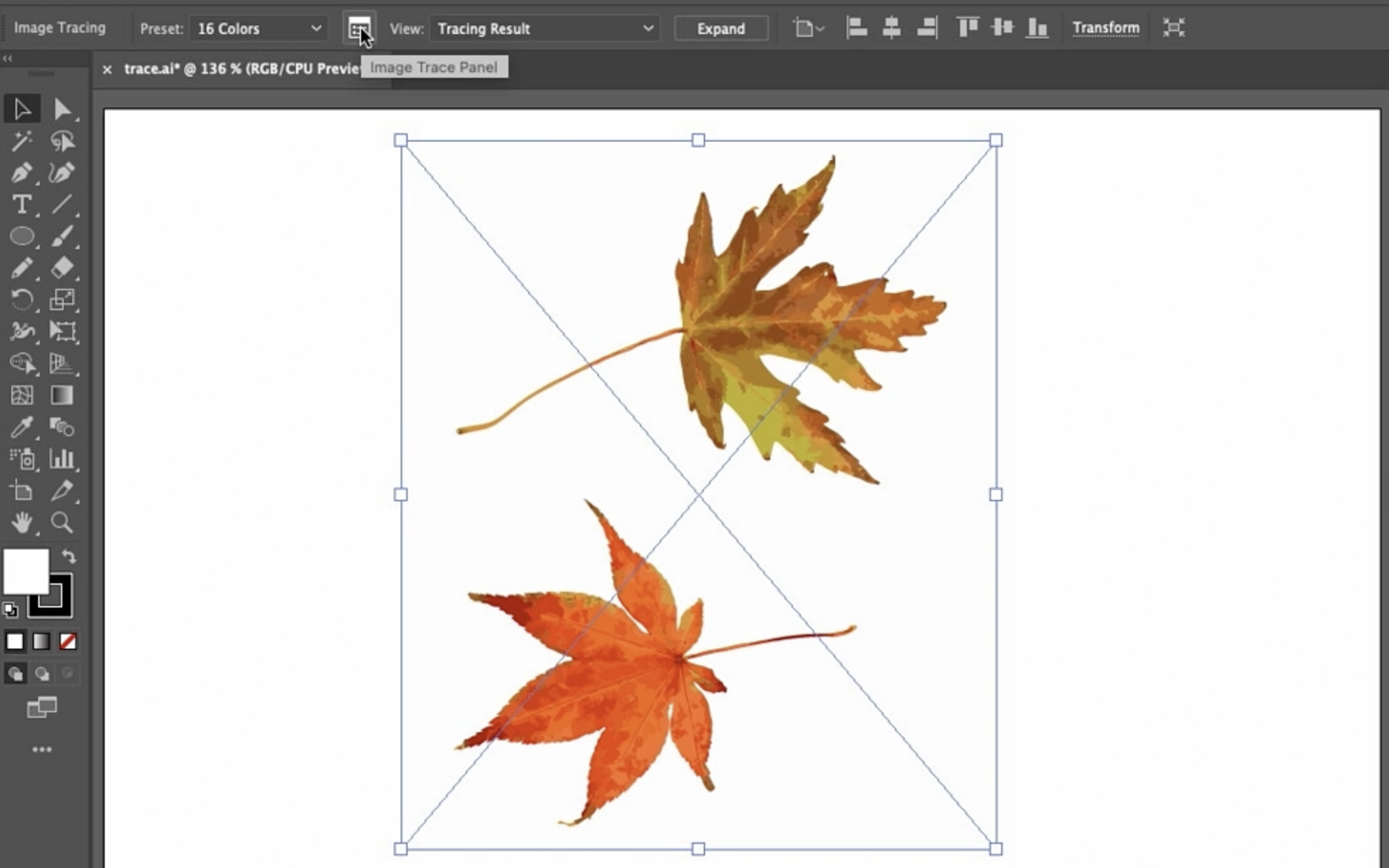 • 여기서 **16가지 색상(16 colors)**과 같이 이미지의 색상을 잘 나타낼 수 있는 사전 설정을 선택합니다. 일러스트레이터가 초기 픽셀 클러스터링(initial pixel clustering) 및 기타 추적 작업을 시작합니다.