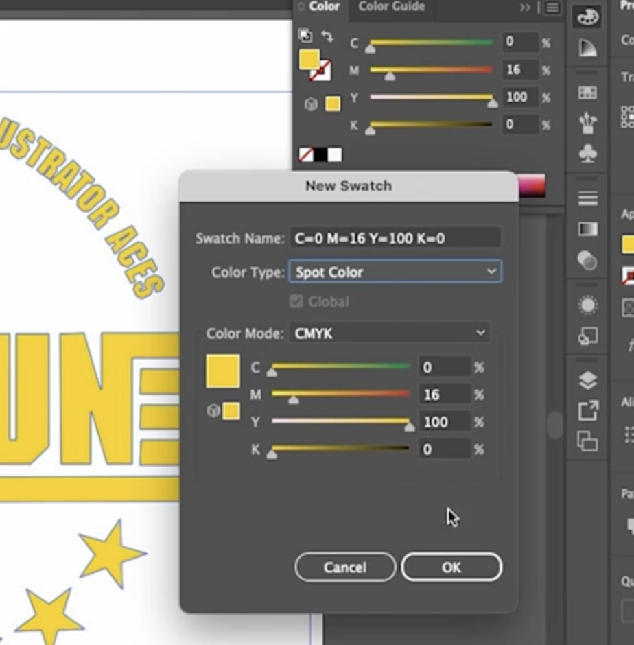 그리고 [프로세스 색상]을 [스폿 색상]으로 변경합니다. 물론, 원한다면 글로벌 색상으로 작업할 수도 있습니다. 중요한 건 항상 프린터와 협의하는 것입니다. 그렇게 해서 스폿 색상 스와치가 스와치 패널에 추가되었습니다. 오른쪽 상단에 작은 점이 있는 것이 보일 겁니다.