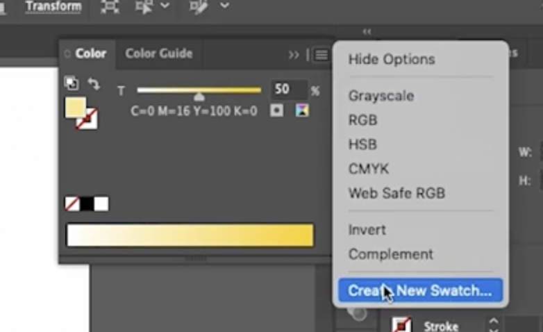 그다음 **오른쪽 상단 메뉴에서 [새 스와치 만들기]**를 선택합니다. 현재 RGB 프로필 문서이기 때문에 CMYK로 바꾸면 약간의 차이는 생길 수 있지만, 정확한 수치를 넣으면 쉽게 동일한 색상으로 맞출 수 있습니다.