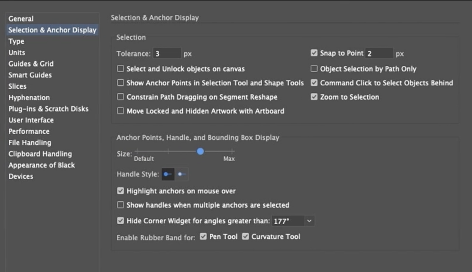 슬라이더를 이용해 앵커 포인트, 핸들, 바운딩 박스가 표시되는 크기를 더 크게 조정할 겁니다.