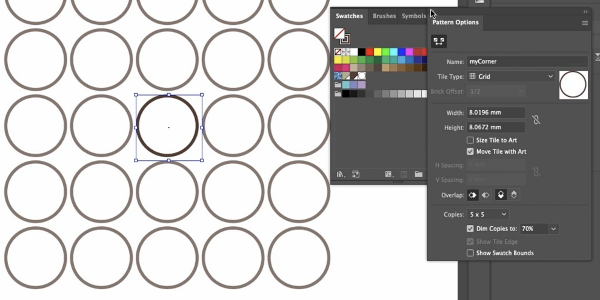 - 패턴 만들기: 원을 선택한 상태에서 **오브젝트(Object) > 패턴(Pattern) > 만들기(Make)**로 이동합니다. 대화 상자에서 이름을 'My Corner'와 같이 지정하고 확인(OK) 및 **완료(Done)**를 클릭합니다.