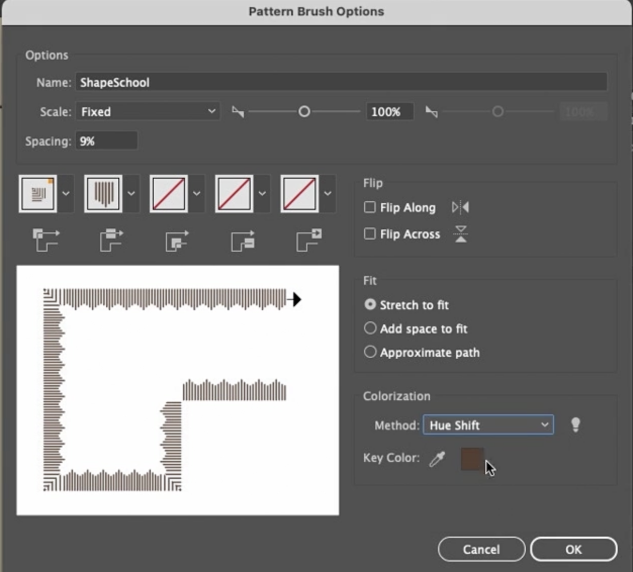 - 늘여서 맞추기(Stretch to Fit): 이 옵션은 간격 문제를 해결하는 데 도움이 되므로 좋은 선택입니다. 다른 브러시에서는 다른 옵션들도 시도해 보세요.