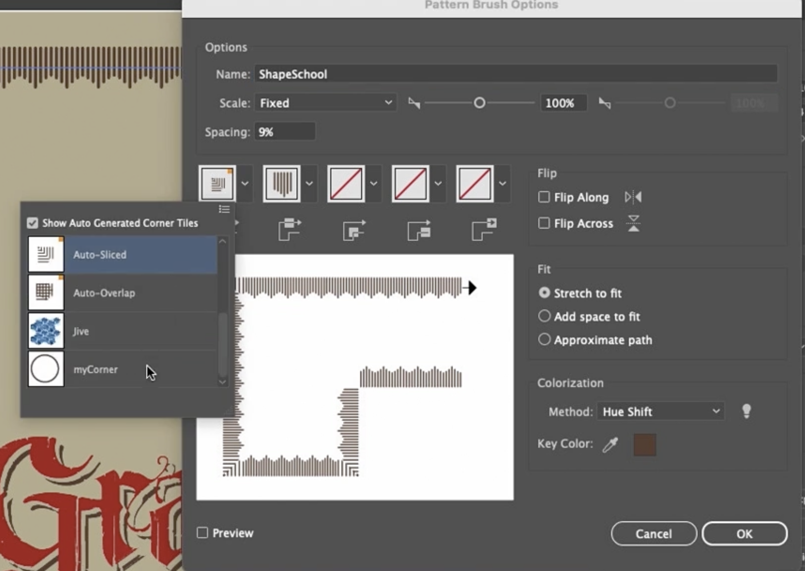 - 코너 타일: 기본적으로 **자동 생성(Auto Generated)**되거나, Illustrator가 자동으로 생성하는 다른 옵션(Auto Centered, Auto Between, Auto Sliced, Auto Overlap)을 시도해볼 수 있습니다. Auto Sliced가 나쁘지 않지만, 원하는 대로 완벽하지 않을 수 있습니다.