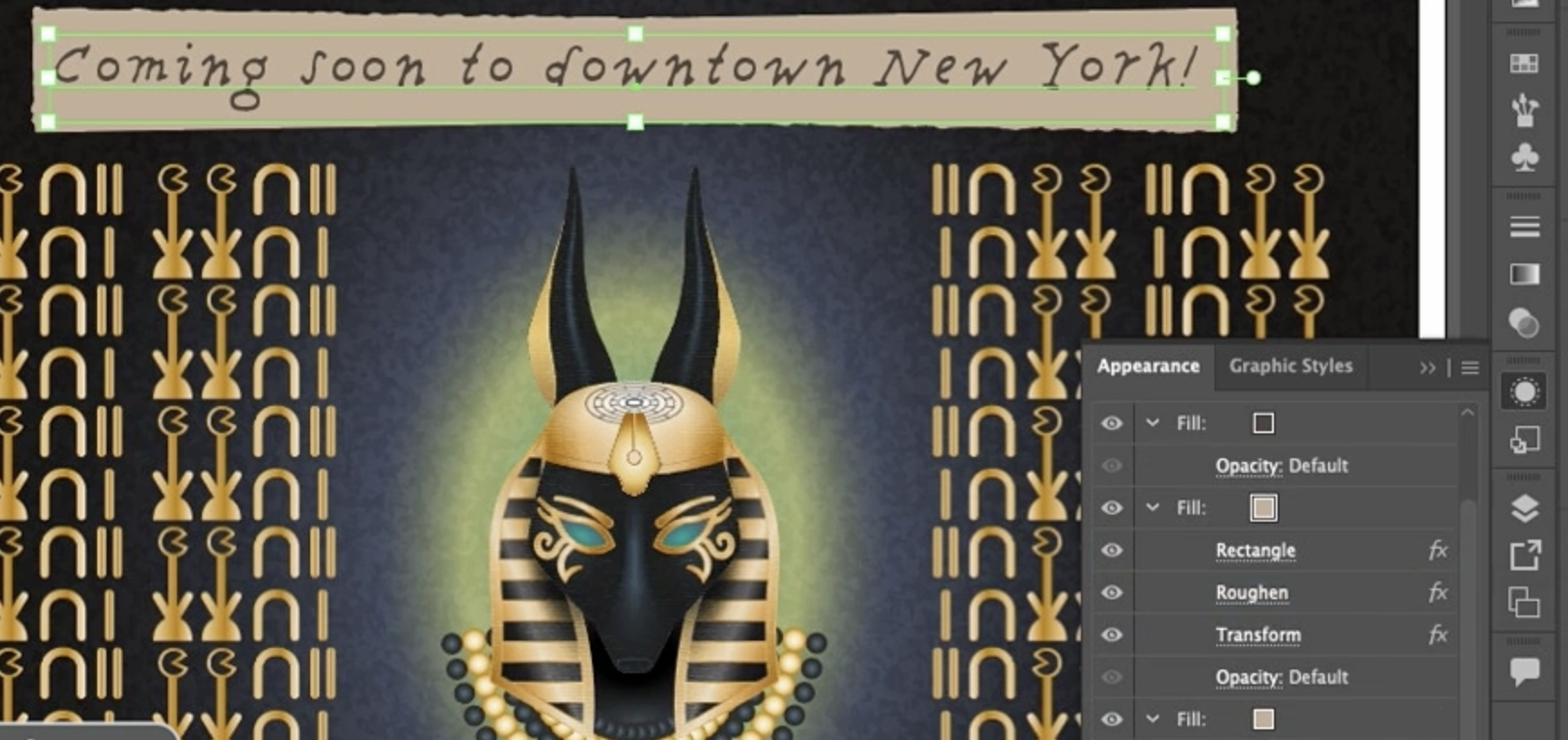이제 확인을 누르면 효과가 적용된 것을 볼 수 있습니다. 여전히 완전히 라이브 상태입니다. 그래서 유형 도구를 선택하고 효과를 변경하고, "다운타운 뉴욕"에서 "서사적이고 거의 평평한 캠브리지셔"로 변경하더라도 모든 것이 여전히 작동합니다. 여전히 이 모든 좋은 것들을 뒤에서 만들어내고 있습니다.