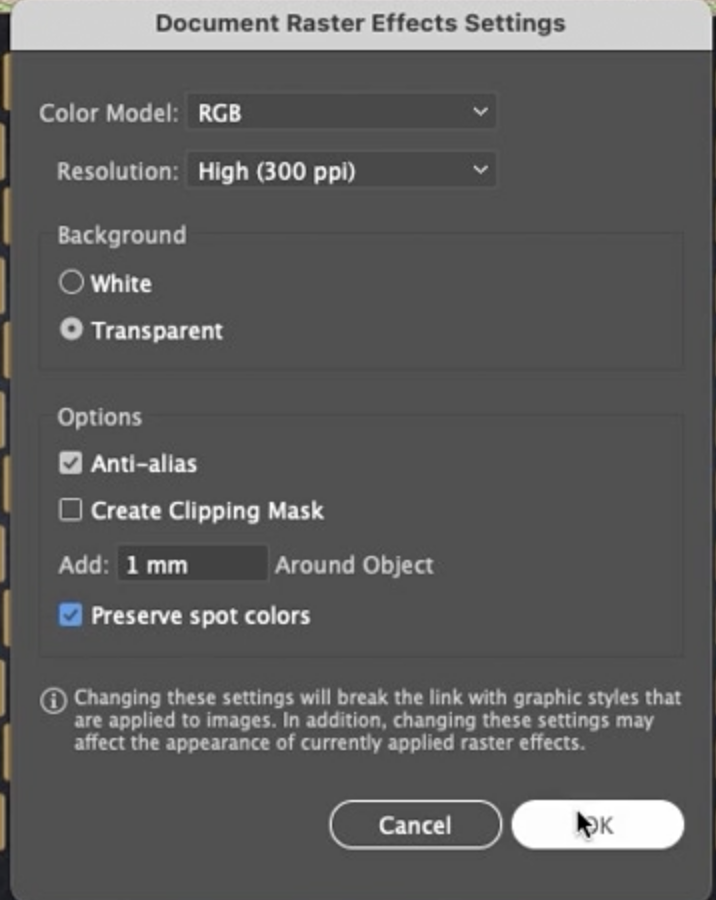 배경은 투명하게 하고 싶습니다. 흰색을 선택할 수도 있지만, 그러면 전체 효과 주위에 상자가 그려집니다. 안티 앨리어스를 켜겠습니다. 클리핑 마스크는 원하지 않습니다. 기본값인 12.7mm 또는 사용하는 측정 단위에 해당하는 값을 원하지 않습니다. 저는 실제로 이것을 1mm로 낮출 것이고, 때로는 0을 사용하기도 합니다. 별색 유지는 별색을 사용하는 경우에 좋습니다. 이제 확인을 누르겠습니다. 텍스처를 주시하고, 자, 보세요! 변경될 것입니다.