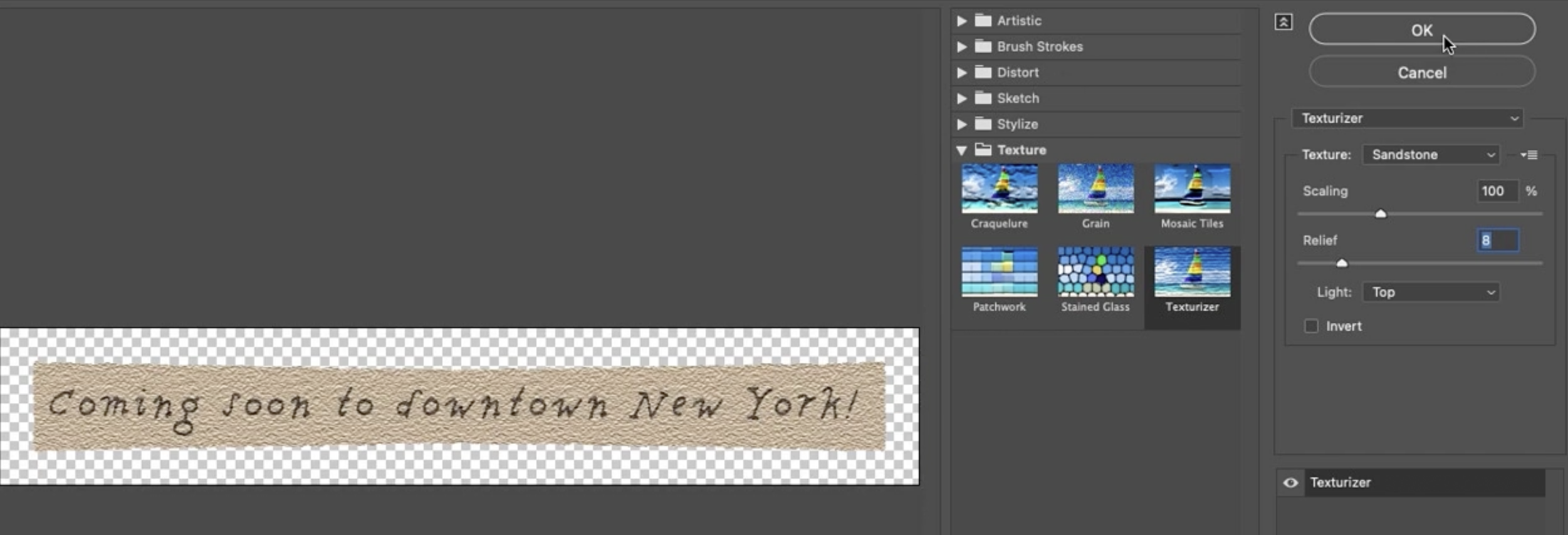 이제 상단의 배너에 무언가를 추가해 봅시다. 텍스처 메뉴로 이동하여 텍스처라이저를 선택하겠습니다. 이 모든 것이 고대 이집트 분위기를 가지고 있기 때문에 사암 효과를 추가하는 것이 좋을 것 같았습니다. 스케일링을 변경할 수 있습니다. 스케일링이 어떻게 변경되는지 볼 수 있습니다. 상당히 크게 가보겠습니다. 100% 또는 그 이상으로 설정하겠습니다. 그리고 여기에 릴리스 슬라이더가 있습니다. 이것은 매우 복잡해질 수 있으므로, 현재는 약 8로 낮추겠습니다. 이 시점에서 저와 의견이 다를 수도 있지만, 괜찮습니다. 단지 이것 뒤에 올 다른 것이 있기 때문에 이 숫자를 선택한 것입니다.