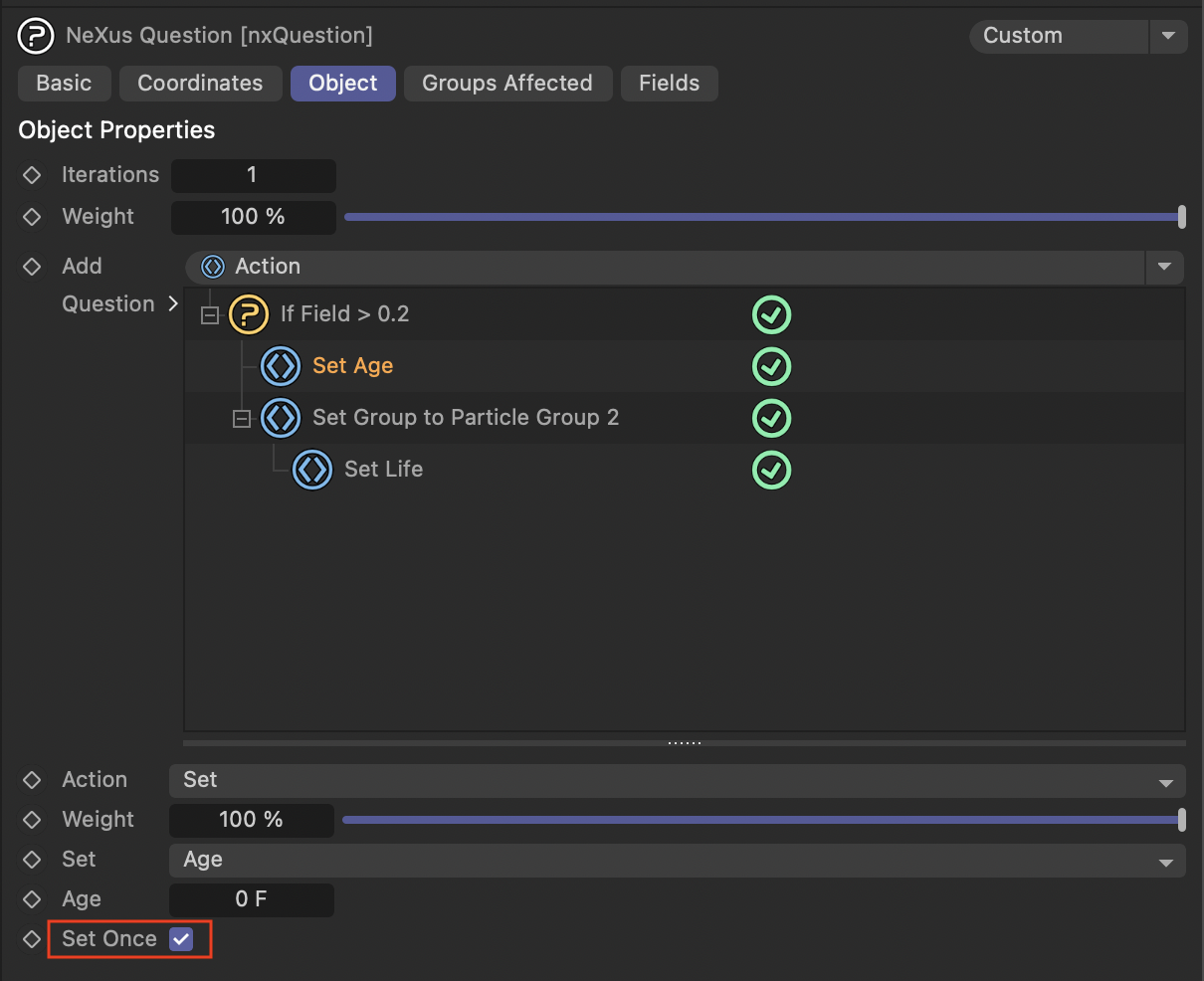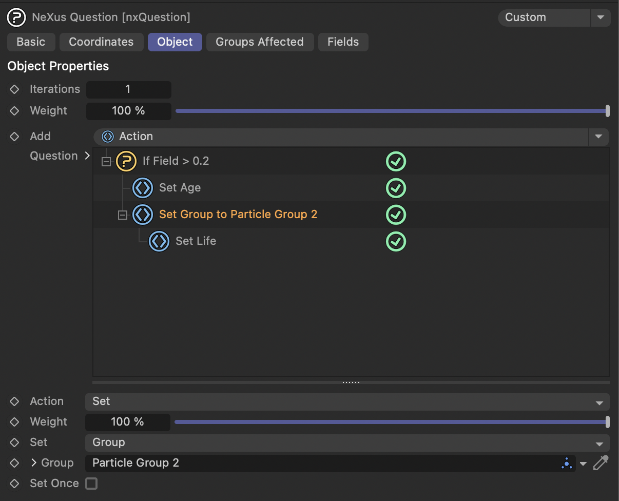 - NX 질문을 사용하여 두 번째 그룹으로 설정한 후 파티클의 나이를 0으로 재설정하는 액션을 추가합니다.