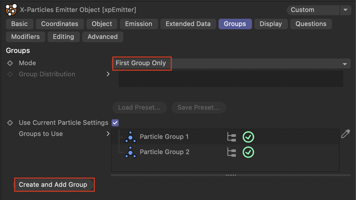 - 방출기 그룹 탭에서 그룹을 두 번 추가하여 첫 번째 그룹에 모든 파티클을 넣고, 두 번째 그룹에만 수정자가 영향을 미치도록 설정합니다.