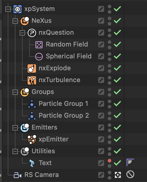 Object Manager 에서 보는 것처럼 Particle의 그룹 1, 그룹 2를 생성하고 Field를 통해 그룹 2로 전환시키면서 nxExplode, nxTurbulence를 적용시키도록 설정합니다.