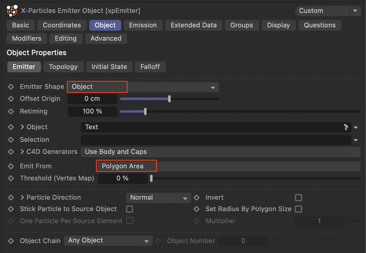 - 원하는 텍스트 객체를 생성하고, XP 방출기를 사용하여 텍스트 표면에서 파티클을 방출하도록 설정합니다.
