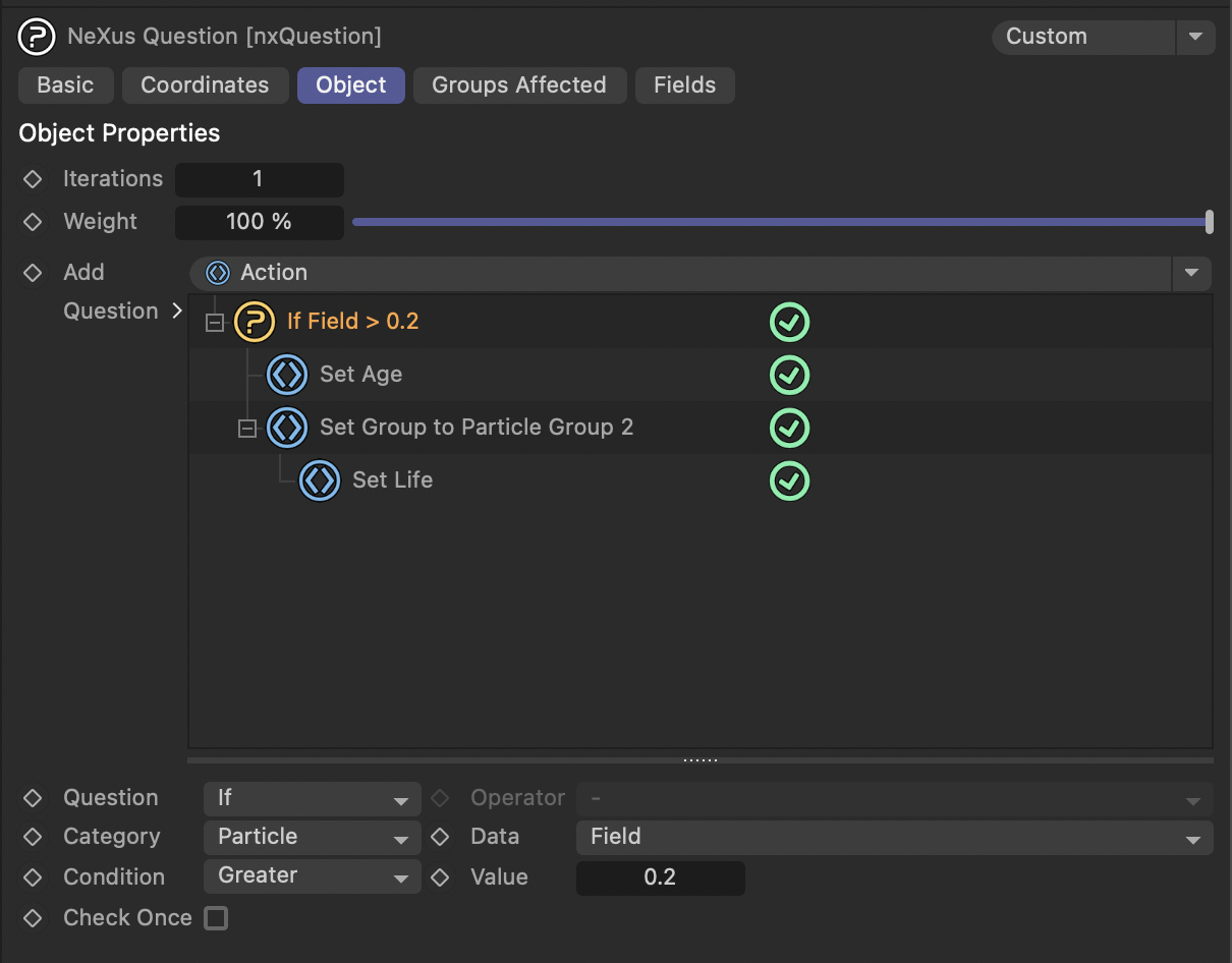- nxQuestion을 사용하여 필드 안에 있는 파티클을 두 번째 그룹으로 이동시키도록 설정합니다.