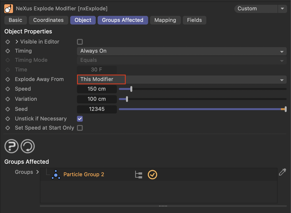 - 기본적으로 파티클 질량 중심에서 폭발하도록 설정되어 있지만, 사용자가 원하는 위치로 중심점을 설정할 수 있습니다.