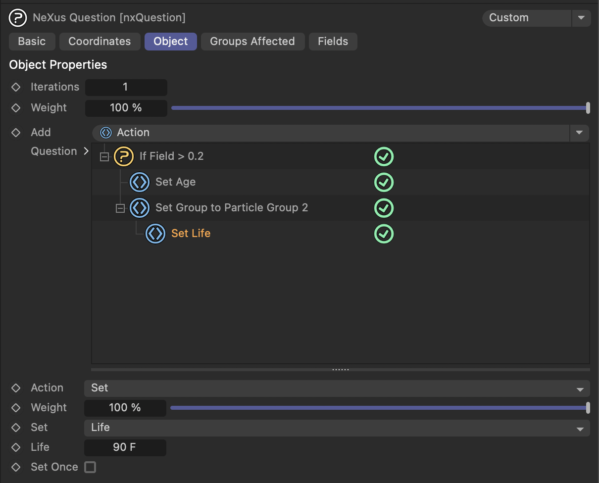- NX 질문을 사용하여 두 번째 그룹으로 설정한 후 파티클의 나이를 0으로 재설정하는 액션을 추가합니다.