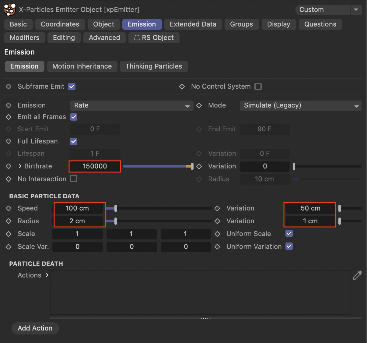 - 방출 속도를 150000 파티클/초로 설정.