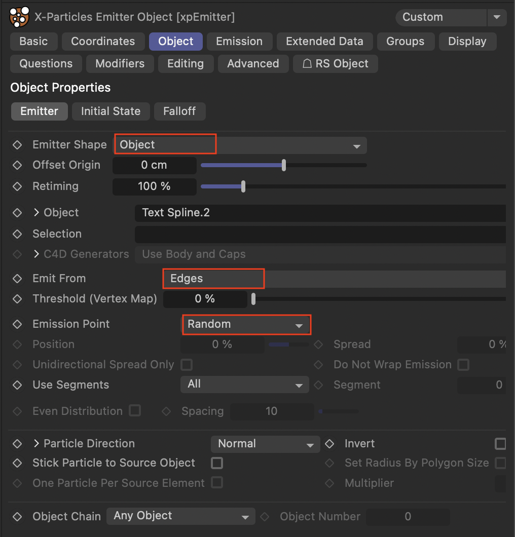 - 텍스트 스플라인을 드래그하여 가장자리에서 방출하도록 설정.