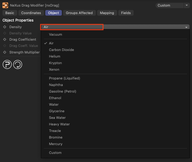 nxDrag의 Density 설정에서 다양한 종류의 밀도를 선택할 수 있습니다. 각 밀도는 입자의 움직임에 다른 영향을 미치며, 이를 통해 다양한 시뮬레이션 효과를 얻을 수 있습니다. 아래는 각 밀도 종류에 대한 자세한 설명입니다: