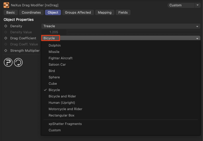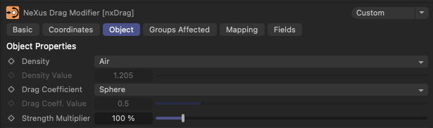 nxDrag의 Drag Coefficient 설정에서 다양한 객체의 항력 계수를 선택할 수 있습니다. 각 항력 계수는 입자의 움직임에 다른 영향을 미치며, 이를 통해 다양한 시뮬레이션 효과를 얻을 수 있습니다.