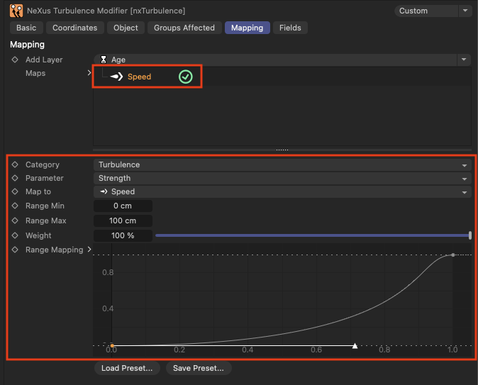 nxTurbulence의 Mapping 기능 중 Speed는 입자의 속도를 제어하는 데 사용됩니다. 이 기능을 통해 입자의 움직임을 더욱 정교하게 조절할 수 있습니다. 아래는 Speed Mapping에 대한 자세한 설명입니다: