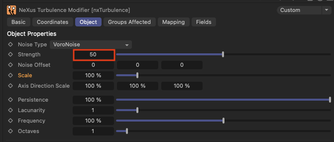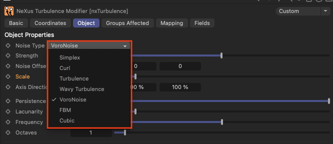 nxTurbulence의 Object 탭에서 다양한 Noise Type을 설정할 수 있습니다. 각 Noise Type은 입자 시뮬레이션에 독특한 효과를 제공합니다. 아래는 각 Noise Type에 대한 자세한 설명입니다: