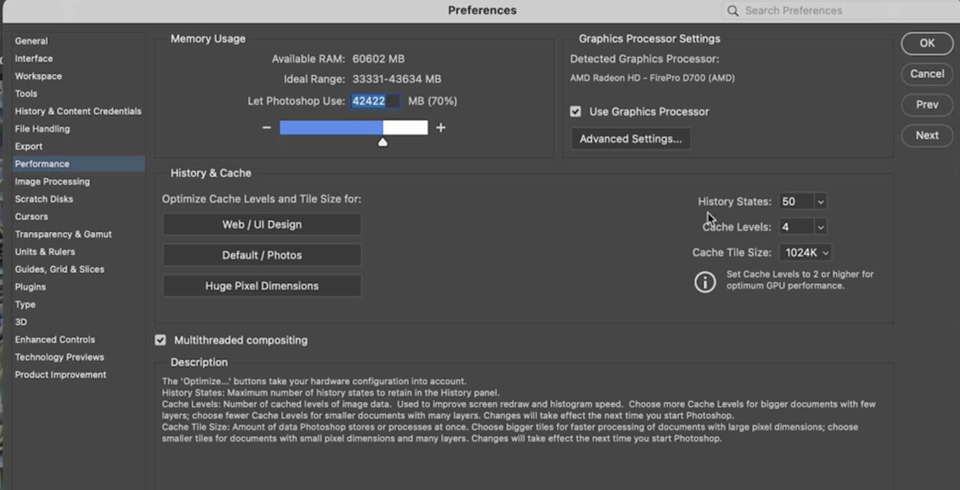 (Windows에서는 Edit > Preferences > Performance 경로로 들어가면 됩니다.)
