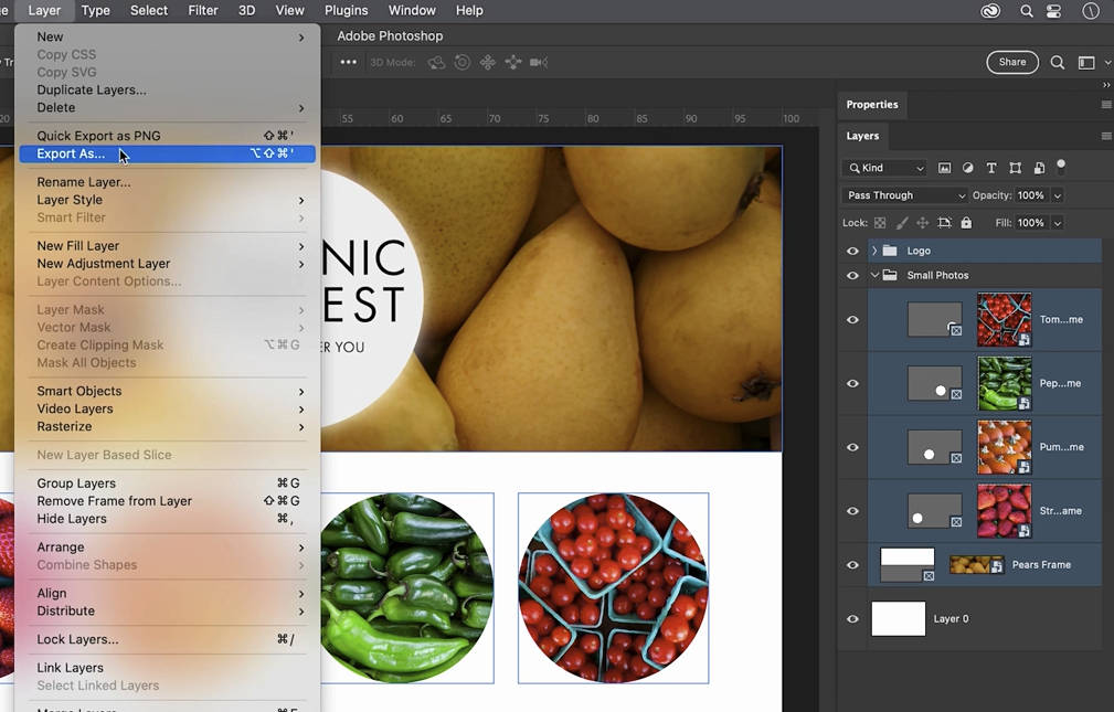 이제 저는 로고를 하나의 파일로 내보내고 싶습니다. 그리고 작은 이미지들 각각도 내보내고 싶습니다. 그래서 각각의 이미지와 ‘pears frame’ 레이어 그룹을 선택합니다.