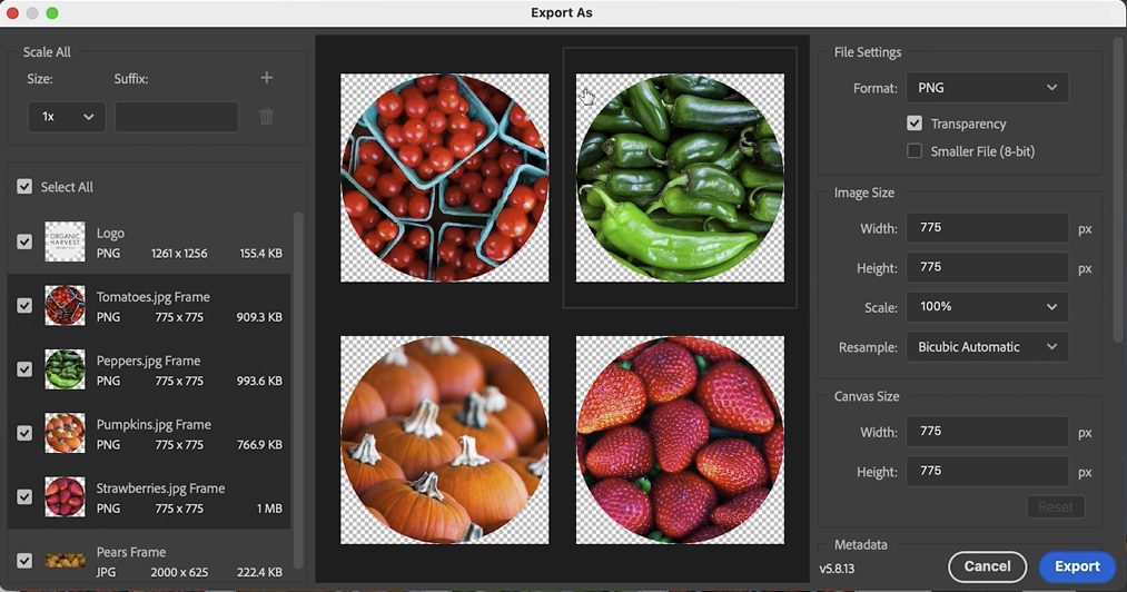 다음으로, 토마토에서 딸기까지의 이미지들을 선택합니다. 기본적으로는 이 이미지들이 사진이기 때문에 JPEG로 저장해야 할 것처럼 느껴질 수 있습니다. 하지만 **JPEG 형식은 평면화(flattened)**되기 때문에, 배경이 흰색으로 나올 수 있습니다. 만약 그런 것을 원치 않는다면, PNG 형식으로 저장하면 됩니다. 파일 용량은 약간 커질 수 있지만, 투명 배경을 유지할 수 있습니다.