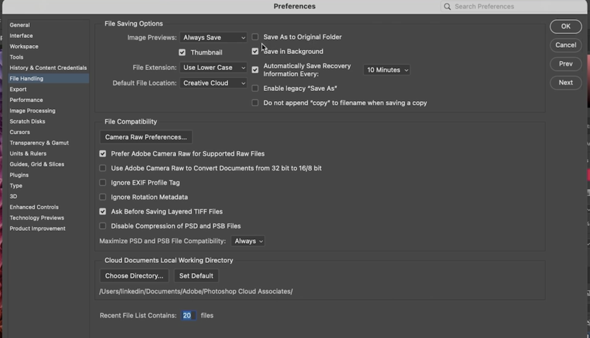 편집한 PSD나 TIFF를 항상 원본 폴더에 저장할지, 아니면 마지막으로 저장한 폴더에 저장할지는 Preferences → File Handling의 “Save As to Original Folder” 옵션으로 설정할 수 있습니다. 필요에 따라 체크를 해제하면, 최근 저장한 폴더로 자동 지정됩니다.