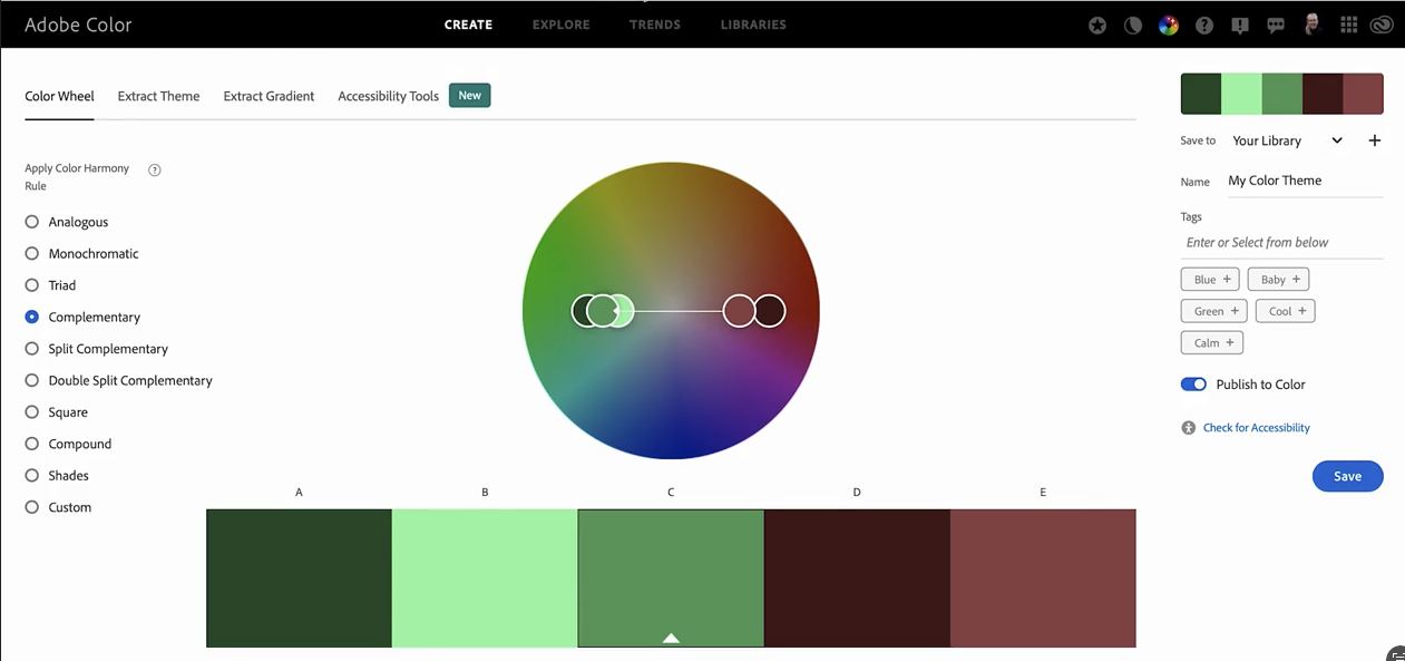 브라우저에서 color.adobe.com을 입력하면 Adobe에서 제공하는 색상 조합 도구에 접근할 수 있습니다.