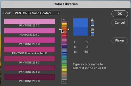 색상 피커 창에서 컬러 라이브러리로 이동하면 다양한 색상 견본집(color book) 중 선택할 수 있습니다. 원하는 색상을 고르고 다시 색상 피커로 돌아올 수 있습니다.