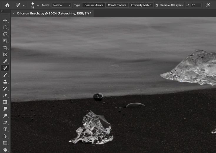 이제 복구 브러시가 백그라운드 레이어에서 샘플링하고 retouching 레이어에 적용되도록 하려면 ‘모든 레이어 샘플링’ 옵션을 활성화해야 합니다.