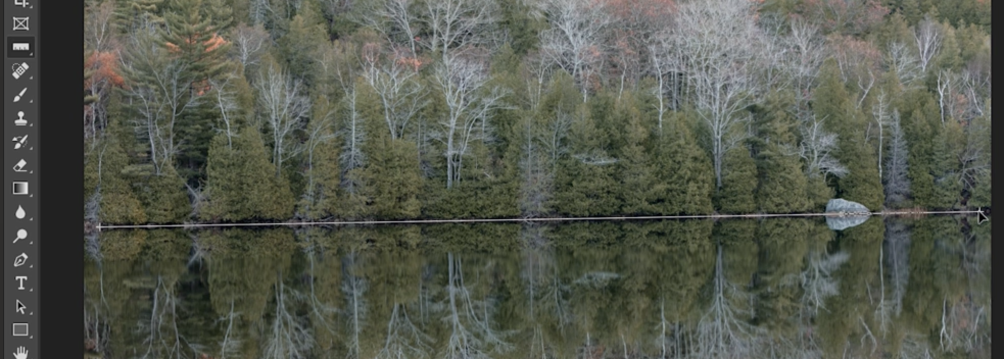 먼저 자르기 도구(Crop Tool) 를 선택합니다 (C 키). 그런 다음 옵션 바에서 수평 맞춤 도구(Straighten Tool) 를 선택합니다. 이 상태에서 수평선(예: 지평선) 을 따라 클릭하고 드래그하면, Photoshop이 자동으로 이미지를 회전하여 수평을 맞춰줍니다.
