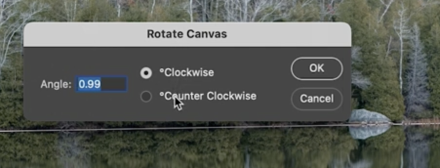 이때 Photoshop은 자동으로 측정한 각도를 회전 창에 입력해줍니다. 시계 방향(Clockwise) 또는 반시계 방향(Counterclockwise) 중 선택하고 적용하면 됩니다.