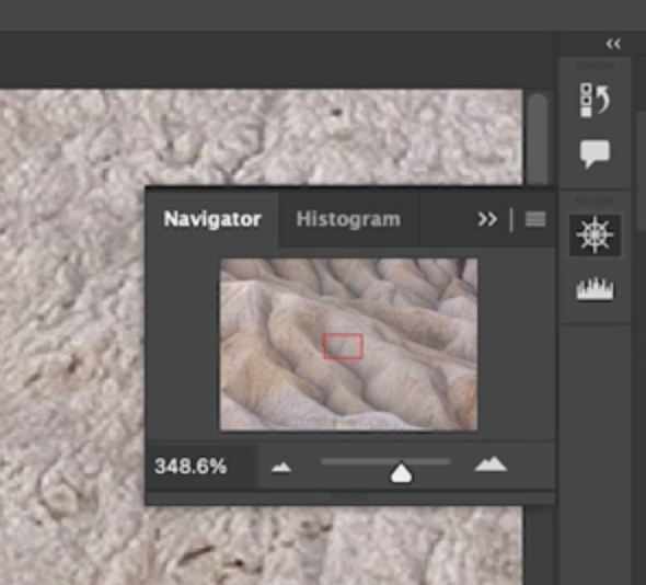 또 다른 방법은 Navigator 패널을 사용하는 것입니다. 기본적으로 표시되지 않기 때문에, Window 메뉴 → Navigator를 선택해 열어야 합니다. 빨간 사각형은 현재 보고 있는 이미지 영역을 나타냅니다. 슬라이더로 확대/축소하거나, 정확한 비율을 입력해서 지정할 수도 있습니다. Command(Control) 키를 누른 채 드래그해서 보고 싶은 영역을 지정할 수도 있습니다.