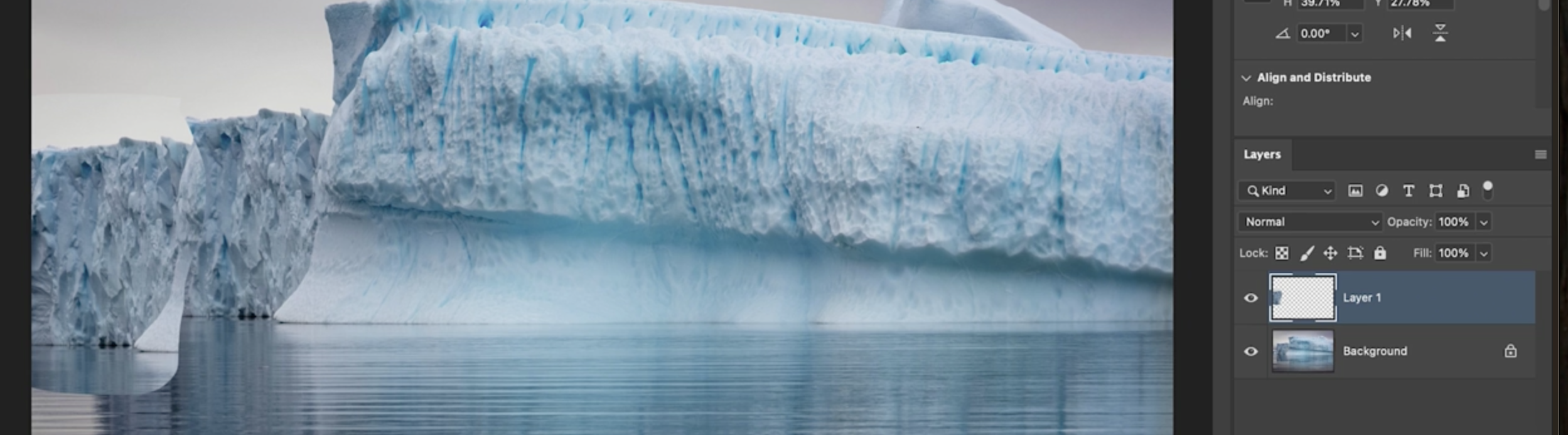 이미지에서 큰 요소를 제거하려고 할 때는, 양질의 정보가 담긴 넓은 영역을 복사해서 그 불필요한 콘텐츠를 대체하는 것이 좋습니다. 예를 들어, 이 사진에서 저는 수직선과 수평선의 조화가 핵심인데, 뒤쪽에 있는 지저분한 빙산이 마음에 들지 않아서 그것을 교체하고자 합니다.