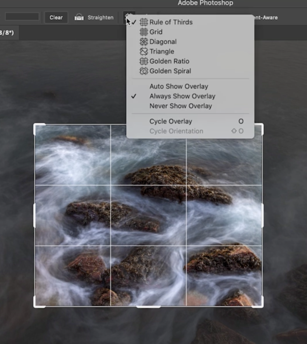 Photoshop은 여러 가지 오버레이(Overlay) 도 제공합니다. O 키를 눌러 오버레이를 순환하며 볼 수 있습니다. 예를 들어, 삼등분 가이드(Rule of Thirds) 등이 포함되어 있습니다. 개인적으로는 항상 보이는 설정보다 Auto Show Overlay 옵션을 선호합니다. 이 경우 자르기를 수정할 때만 오버레이가 보입니다.
