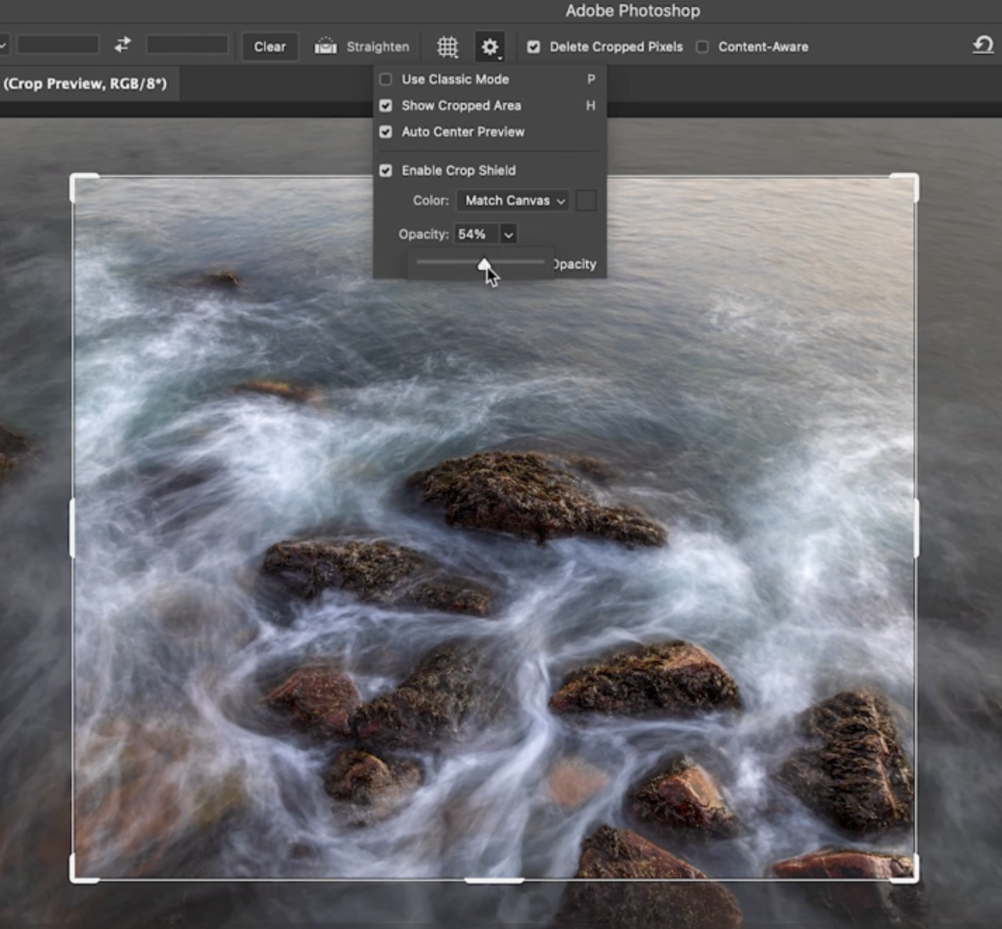 그 옆에는 ‘Delete Cropped Pixels(자른 픽셀 삭제)’ 옵션이 있습니다. 이 기능이 기본적으로 켜져 있어서, 지금 자르기를 적용하면 자르기 영역 밖의 픽셀은 삭제됩니다. 이 이미지가 배경 레이어(Background Layer) 일 경우, 자르기를 적용하면 단일 배경 레이어 상태로 남게 됩니다. 체크 버튼이나 Enter/Return 키로 자르기를 확정할 수 있으며, 이후에는 자른 바깥 부분의 정보는 사라집니다.