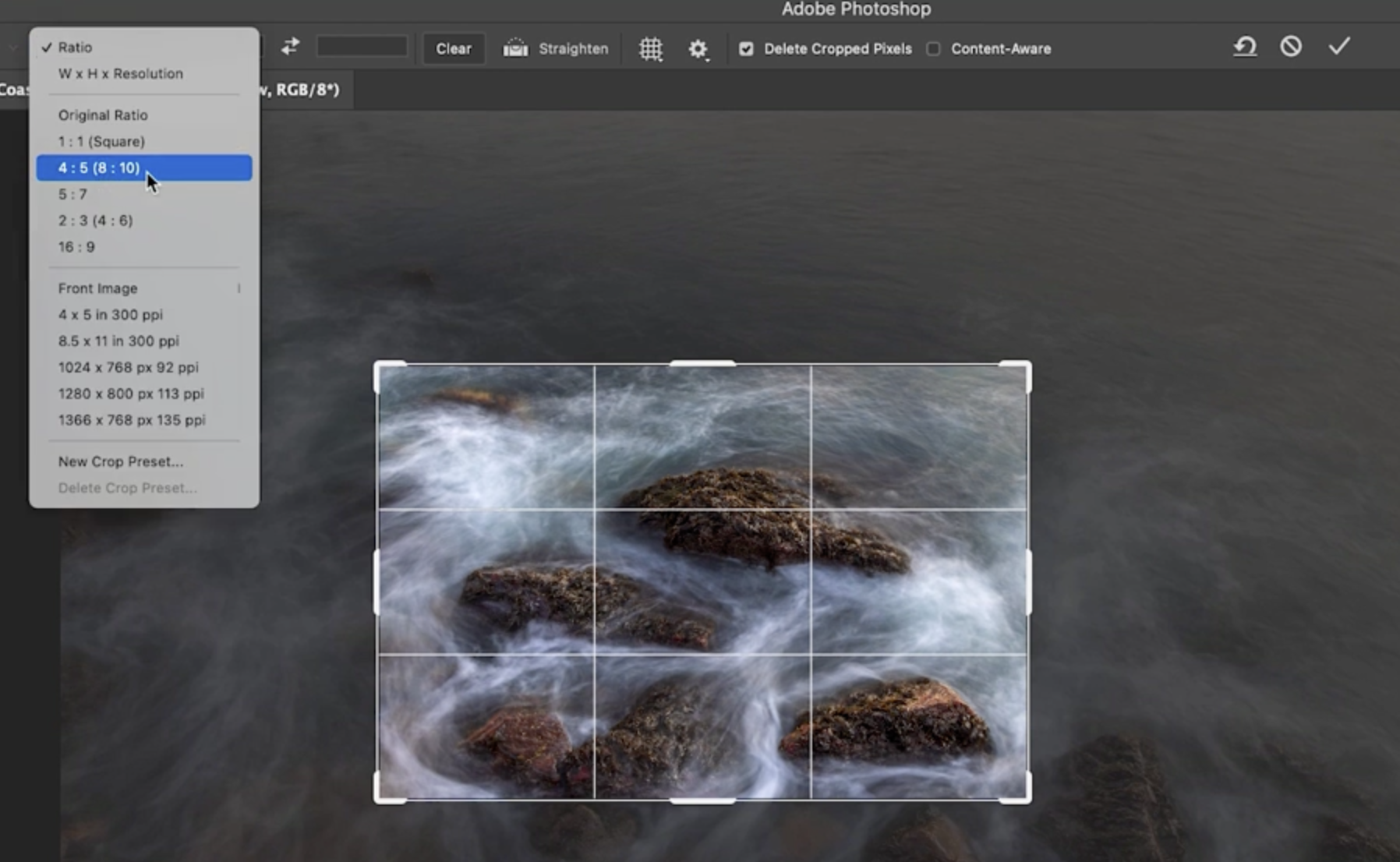 또한, 비율(Aspect Ratio) 을 미리 정할 수 있습니다. 예를 들어, 4:5를 선택하면 해당 비율로 자르기 영역이 고정됩니다. 이후에도 크기를 조정하거나 위치를 바꿀 수 있으며, X 키를 누르면 가로세로 비율을 뒤바꿀 수 있습니다. 비율을 없애고 자유롭게 조절하려면 ‘Clear’를 클릭하면 됩니다.