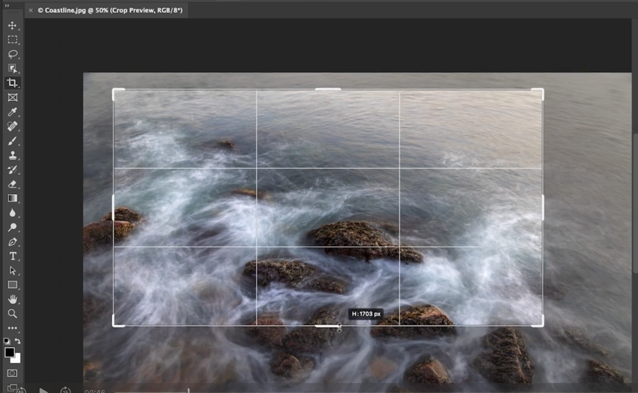 C 키를 누르거나 도구 막대에서 선택하여 자르기 도구를 사용할 수 있습니다. 기본적으로 Photoshop은 이미지 전체에 자르기 테두리(Crop Marquee) 를 표시합니다. 하지만 도구를 처음 선택할 때는, 테두리를 수정하는 대신 이미지 위에서 직접 드래그하여 원하는 자르기 영역을 만들 수 있습니다.