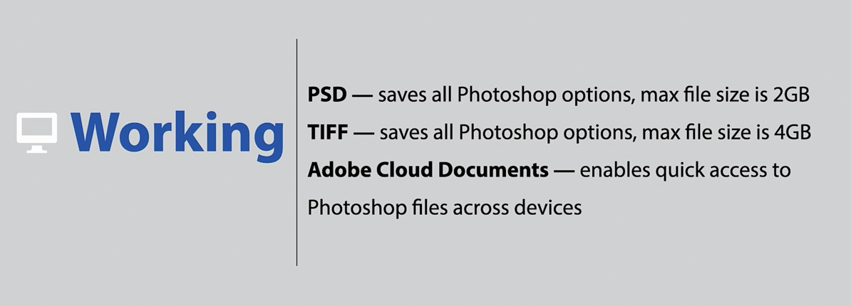 Photoshop에서 이미지를 다룰 때는 다양한 파일 포맷을 이해하는 것이 중요합니다. 이를 쉽게 설명하기 위해, 파일 포맷을 세 가지 작업 흐름으로 나눌 수 있습니다: