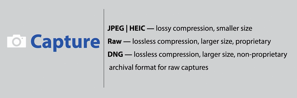 오늘날 대부분의 사진은 JPEG, Apple의 HEIC, 또는 RAW 파일로 캡처됩니다.