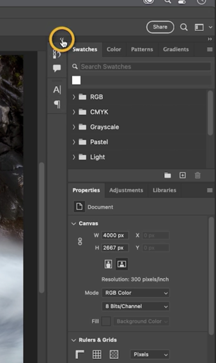 패널이 많아지면 일부 패널은 자동으로 축소됩니다. 확장하려면 탭을 클릭하면 되고, 다른 그룹은 자동으로 접힙니다. 새 열을 추가하면 그룹을 더 나눌 수 있습니다. 예를 들어 Adjustments 패널을 드래그해서 새 열로 놓으면 됩니다.