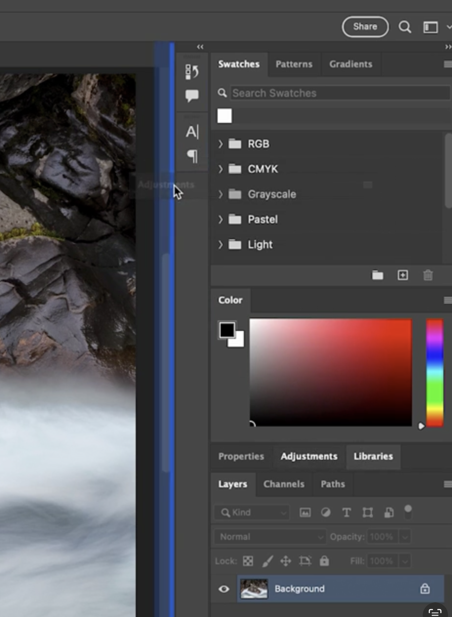 패널은 서로 다른 그룹으로 이동시킬 수 있습니다. 예를 들어 Color 패널을 Properties, Adjustments, Libraries 그룹에 합치고 싶다면, 해당 그룹 위로 드래그해서 파란색 실선 테두리가 나타났을 때 마우스를 놓으면 됩니다. 이렇게 하면 패널이 그룹 안으로 병합됩니다.