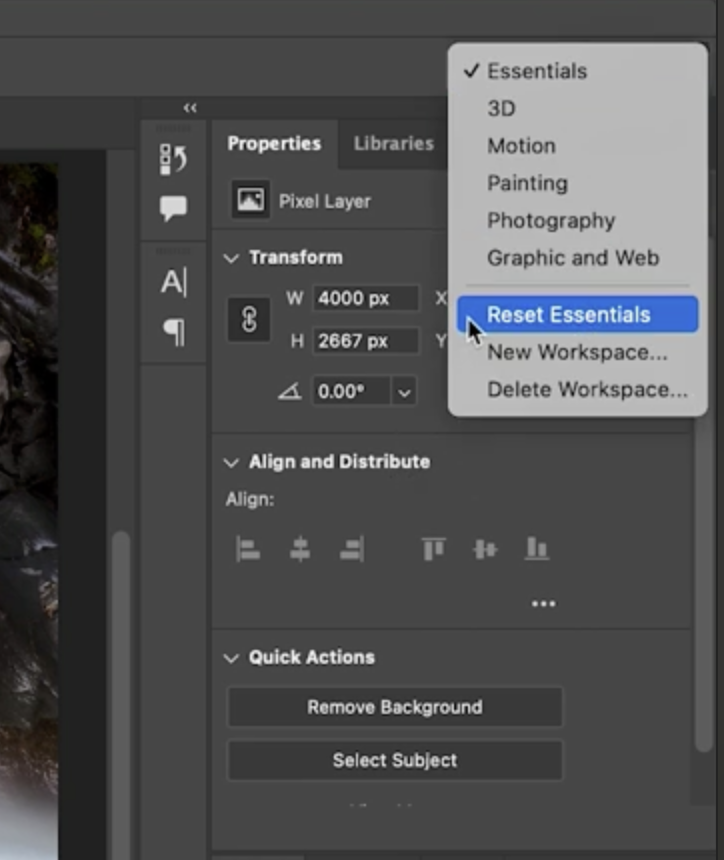 포토샵은 다양한 사람들에게 다양한 용도로 사용되기 때문에 엄청나게 많은 옵션을 가지고 있습니다. 기본적으로 몇 가지 패널이 표시되지만, 그것이 전부는 아닙니다. 포토샵은 화면 해상도에 따라 패널을 다르게 보여주기 때문에, 여러분이 보고 있는 기본 레이아웃이 다를 수 있습니다. 만약 패널 레이아웃이 다르다면, Essentials 초기화(Reset Essentials) 를 선택해 모두 같은 환경에서 시작할 수 있습니다.