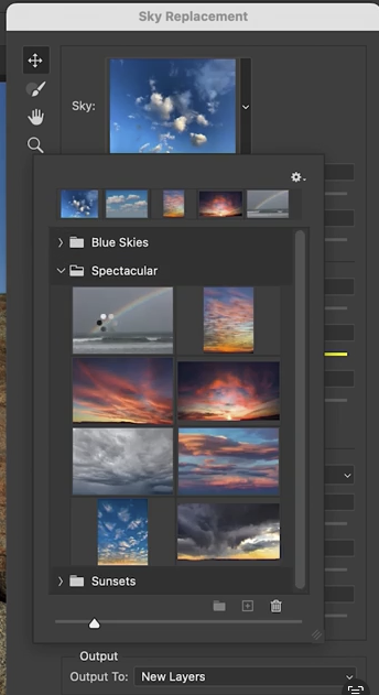 Photoshop에는 기본으로 여러 가지 하늘 이미지가 내장되어 있습니다. 오른쪽의 작은 삼각형 아이콘을 클릭하면 여러 파란 하늘, 구름이 낀 하늘, 그리고 무지개나 극적인 석양 같은 화려한 하늘들까지 고를 수 있습니다.