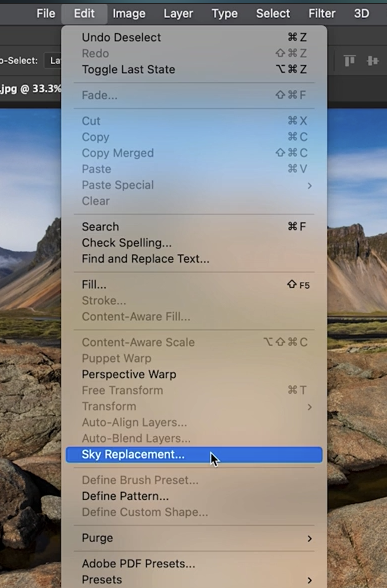 하지만 이번에는 하늘을 교체하려는 상황입니다. 그래서 먼저 **Select > Deselect(선택 해제)**로 기존 선택을 없애고, Edit(편집) 메뉴에서 **Sky Replacement(하늘 교체)**를 선택합니다.