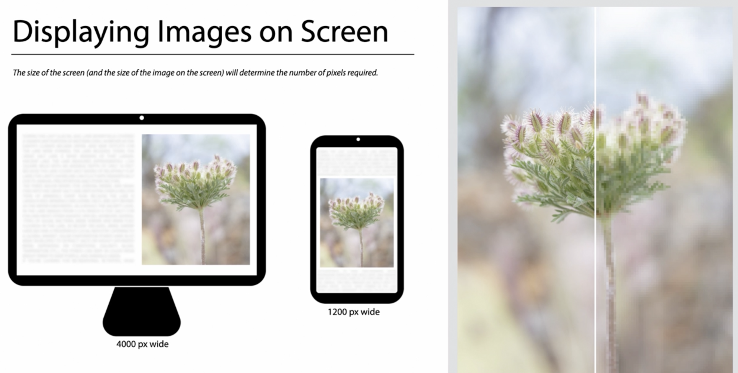 이미지가 고해상도 모니터에 표시된다면, 더 많은 픽셀이 필요할 것입니다. 반면, 작은 모바일 기기에 표시된다면 픽셀 수가 적어도 됩니다.