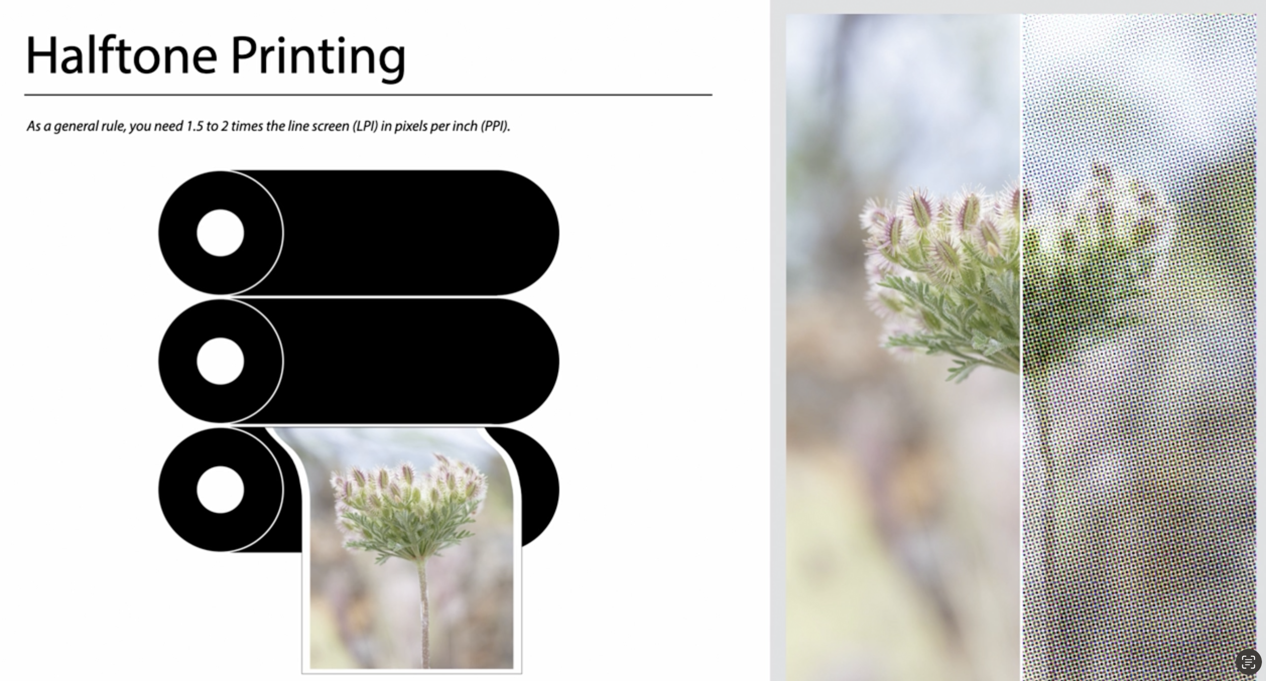 - 하프톤 인쇄는 **라인 스크린 수치의 1.5~2배 해상도(PPI)**가 필요합니다.