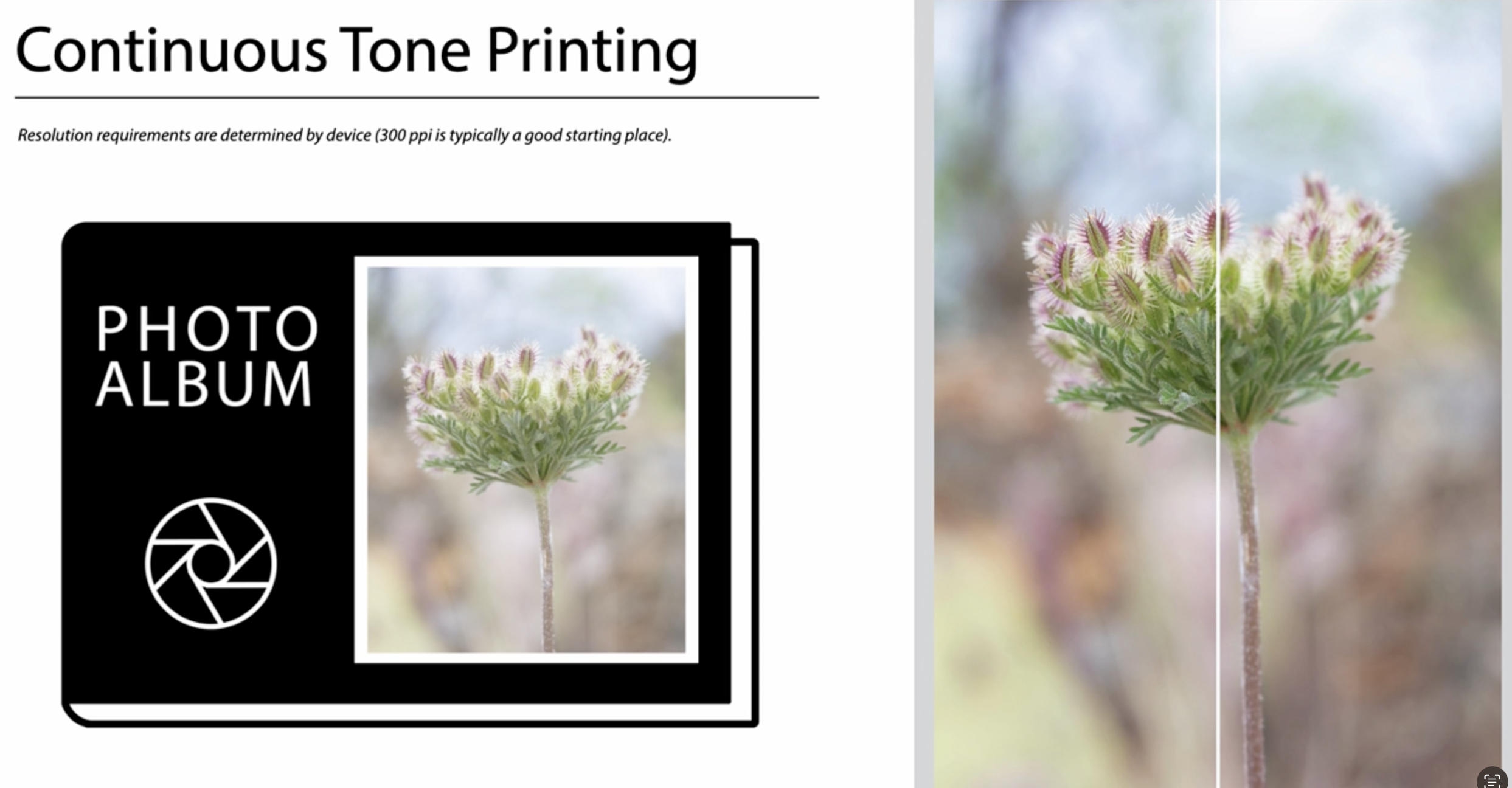 - 연속톤 인쇄는 **컬러 랩에 문의하여 권장 해상도(보통 300 PPI)**를 확인하는 것이 가장 좋습니다.